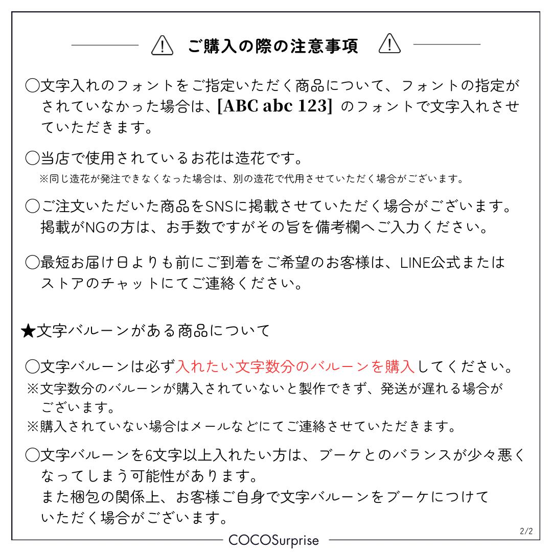 ①『HAPPY BIRTHDAY』の部分は『HAPPY COCOMI DAY』のようにお誕生日の方のお名前を入れることもできます