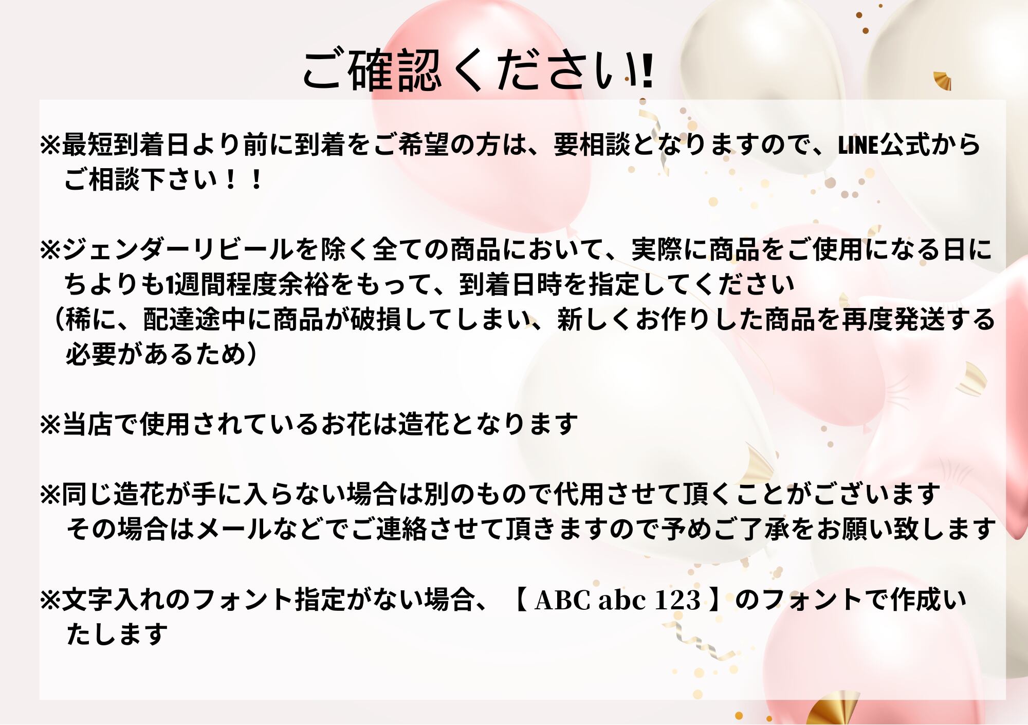 ※ジェンダーリビールを除く全ての商品において、実際に商品をご使用になる日にちよりも1週間程度余裕をもって、到着日時を指定してください