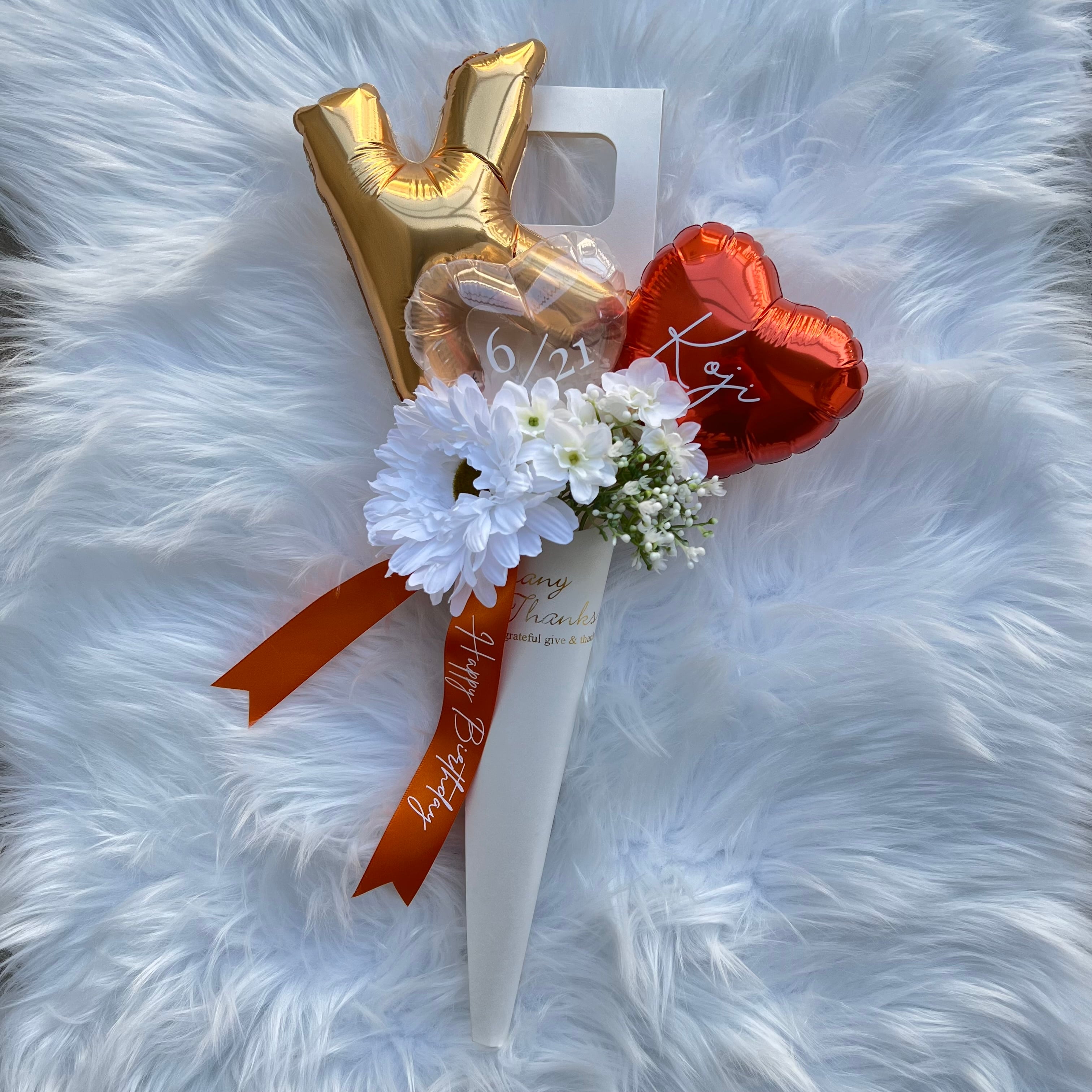 バルーンやリボンのお色が自由にカスタマイズできる文字バルーン入りのジェラート型バルーンブーケをお作りしました♡
